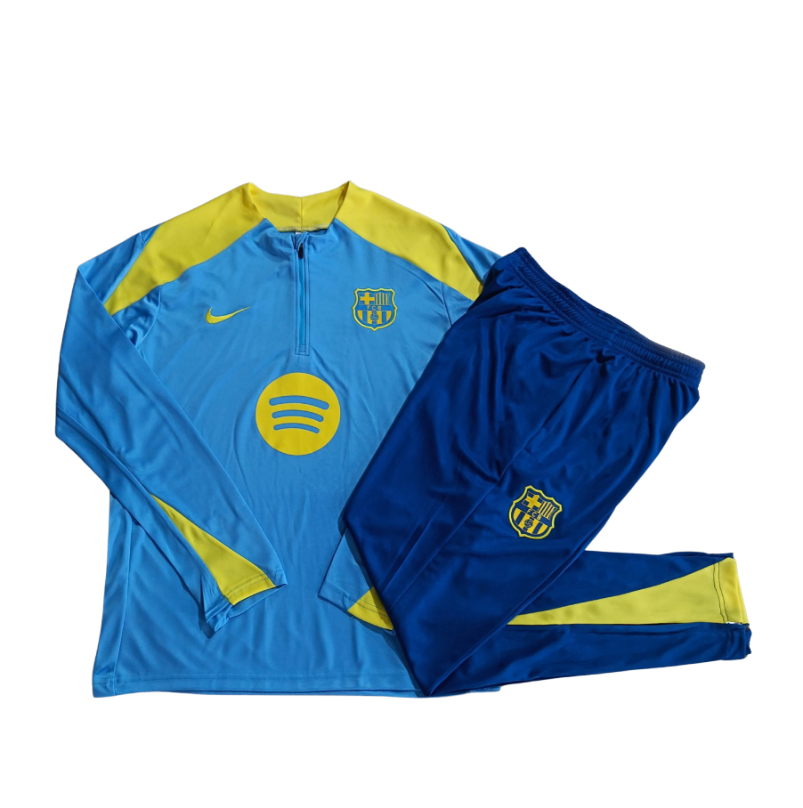 Ce survêtement arbore un bleu nuit sophistiqué, agrémenté de détails grenat et or qui rappellent les couleurs emblématiques du FC Barcelone. Fabriqué en polyester recyclé avec la technologie Dri-FIT, il garantit une gestion optimale de l’humidité pour un confort supérieur, que ce soit lors des entraînements ou dans la vie quotidienne.